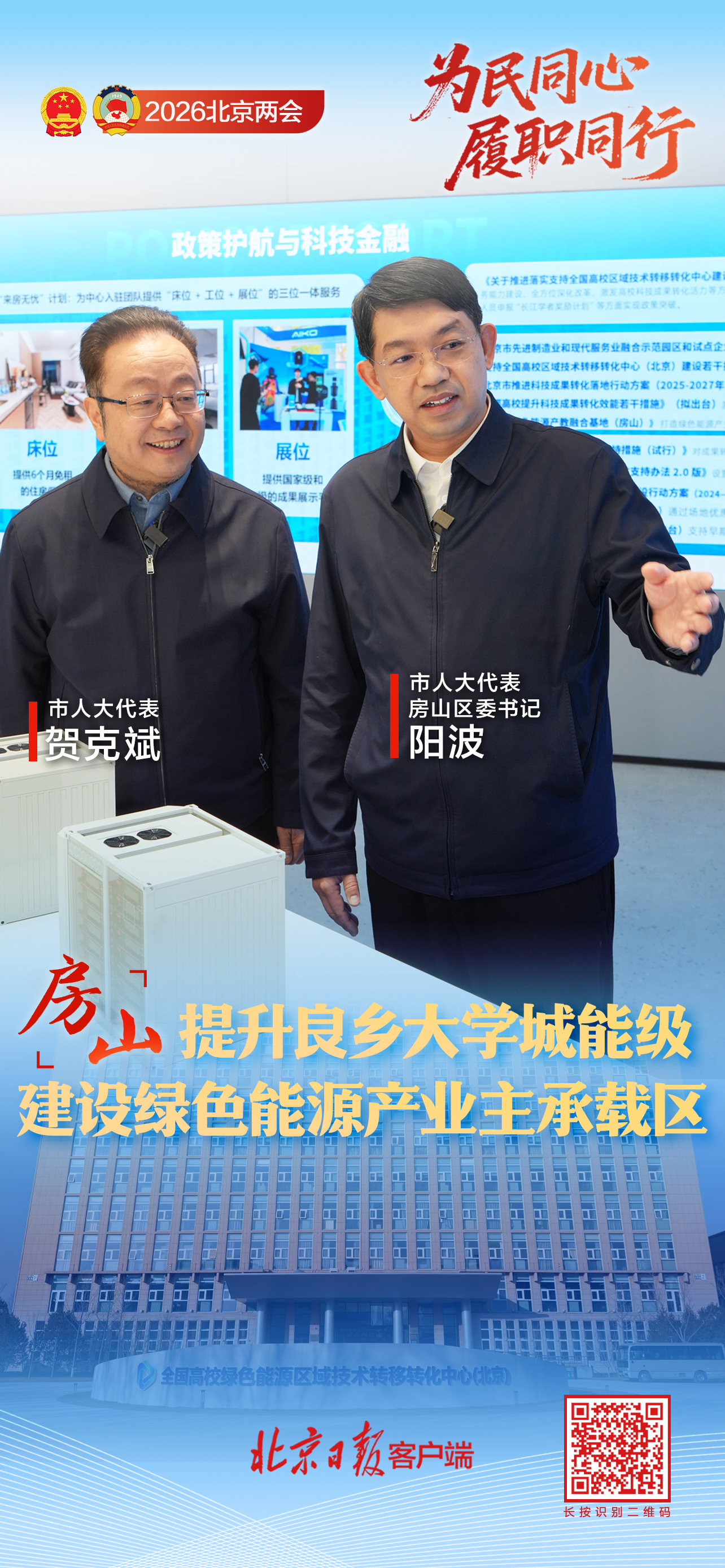 2026年北京市两会前夕,围绕市人大代表贺克斌提出的“加快推动绿色能源产业发展”的建议,房山区委书记阳波邀请贺克斌一起,走进良乡大学城,在全国唯一的高校绿色能源区域技术转移转化中心,解读如何让高校与企业更好对接、不断丰富应用场景,助力科研成果从高校实验室走向市场货架。