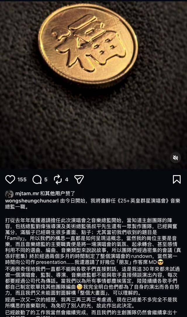 2026年4月9日凌晨,王双骏正式发布辞任声明。他明确表示,从即日起不再担任25+英皇群星演唱会的音乐总监一职。声明中,他回顾了工作过程中的具体经历,强调了沟通障碍对整体制作的影响。辞任决定是在多次考虑后做出的,目的是避免将不符合自己构思的作品冠以自身名义。